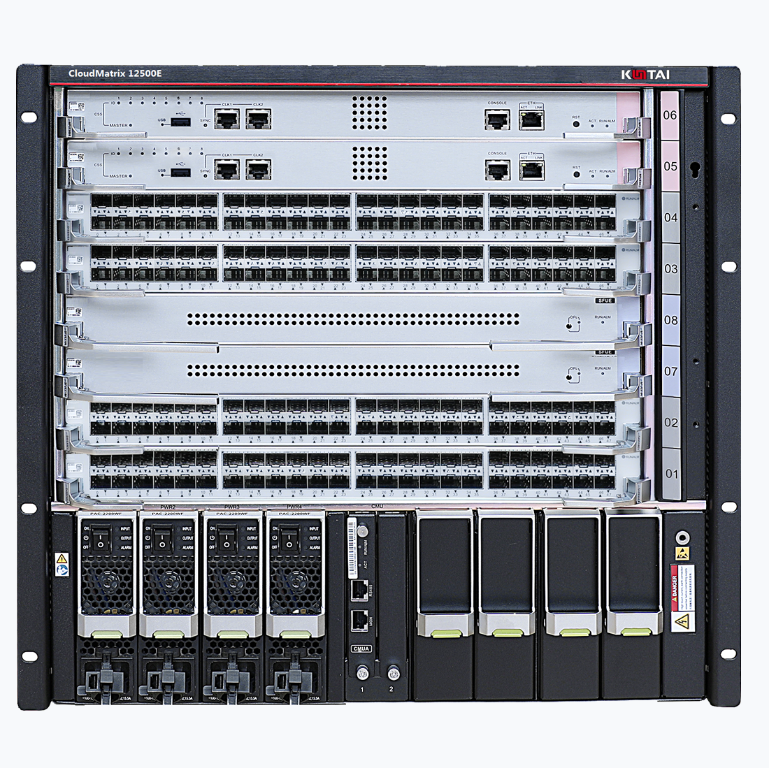 CloudMatrix12500E现给予CM12500E-4和CM12500E-8两种机型,分别支持4/8个业务板插槽。
